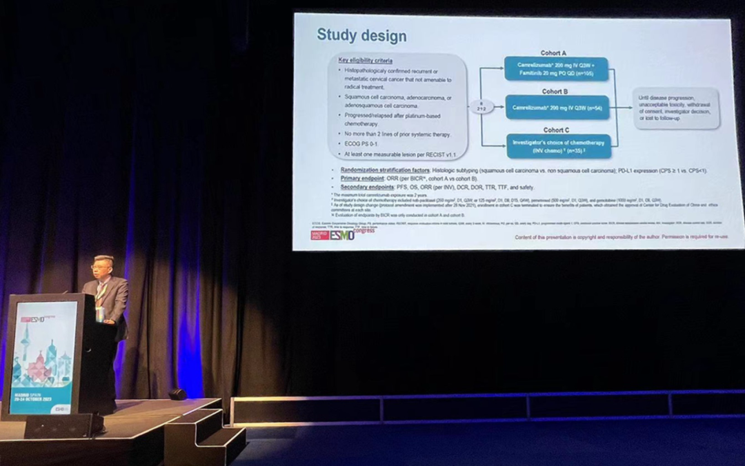 有望为宫颈癌患者带来治疗新选择10月22日,PG医药创新药卡瑞利珠单抗联合法米替尼对比卡瑞利珠单抗单药或研究者选择的化疗治疗复发转移性宫颈癌随机、开放、对照、多中心的Ⅱ期临床研究(SHR-1210-Ⅱ-217) 亮相2023 ESMO大会简短口头报告现场3。该研究由复旦大学附属肿瘤医院吴小华教授团队开展,吴小华教授在现场公布了该重磅研究进展。研究结果显示,在既往以铂为基础化疗失败后复发或转移性宫颈癌患者中,与单独使用卡瑞利珠单抗或研究者选择的化疗相比,卡瑞利珠单抗联合法米替尼显著提高了抗肿瘤活性,安全性可控,有望为晚期宫颈癌患者提供新的治疗选择。